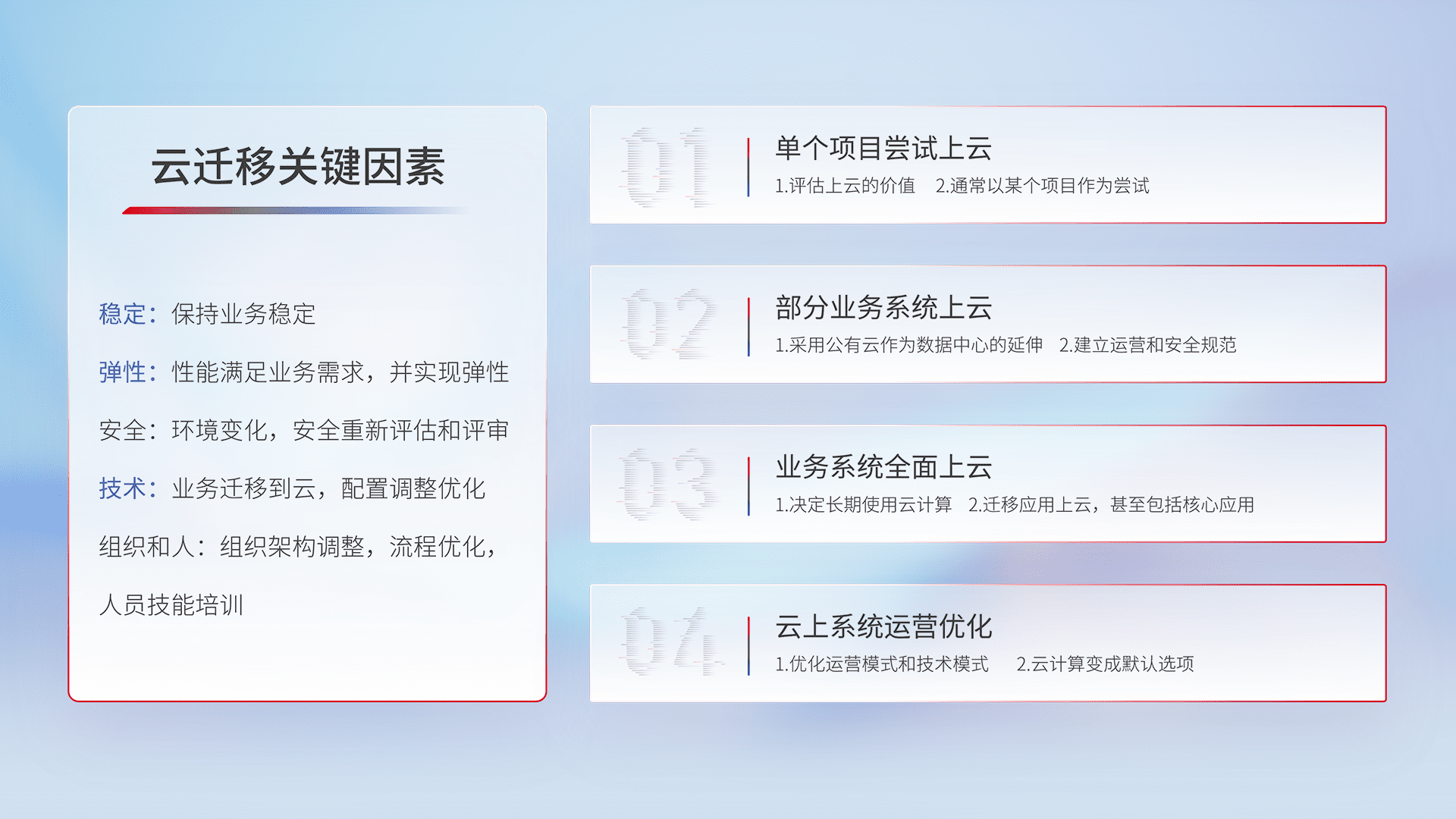 结合实际业务,,,从规划设计、、、、云平台选型、、、、云原生改造、、数据迁移、、、、集成交付,,,,迁移全过程为客户识别最佳上云路径,,,,做好风险识别管理,,设计网络架构、、、、身份权限、、安全审计合规、、操作审计、、、日志审计、、、、监控告警策略、、、多站点容灾设计等,,,,对云上基础设施进行整体规划,,提升IT治理水平,,,以满足弹性、、、、高可用、、高性能的需求。。。